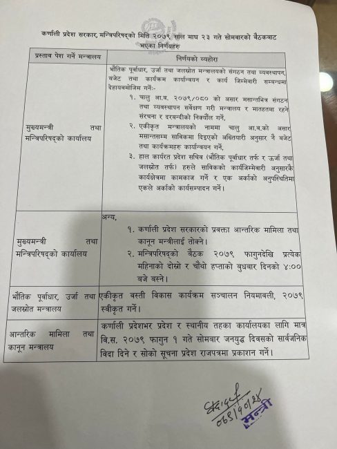 कर्णालीका हिमाली तथा पहाडी जिल्लामा निर्माण भइरहेका एकीकृत बस्ती विकास कार्यक्रमलाई थप व्यवस्थित बनाउनका लागि सञ्चालन नियामावली २०७९ स्वीकृत गर्ने निर्णय भएको छ। फागुनदेखि मन्त्रिपरिषद्को बैठक दोस्रो र चौथो बुधबार बस्ने निर्णयसमेत गरिएको छ।