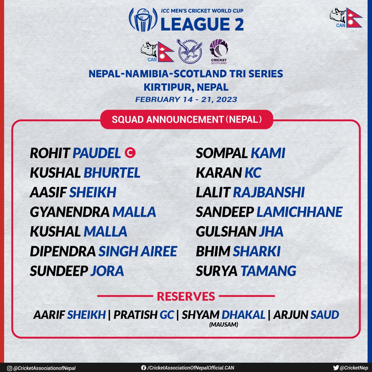 नेपाल, नामिबिया र स्कटल्याण्ड सम्मिलित सिरिज फेब्रुअरी १४ देखि २१ सम्म हुनेछ ।