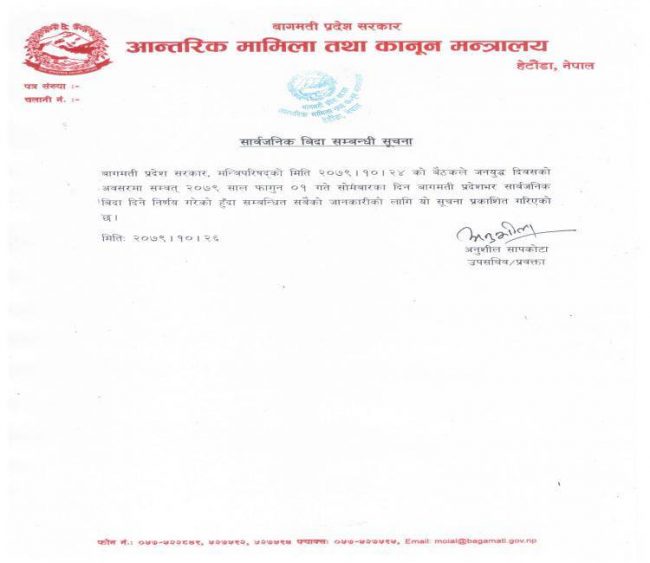 बाग्मती प्रदेश, आन्तरिक मामिला तथा कानुन मन्त्रालयका प्रवक्ता अनुशिल सापकोटाले जारी गरेको सुचनामा भनिएकाे छ, ‘जनयुद्ध दिवसको अवसरमा सम्बत २०७९ फागुन १ गते सोमवारका दिन बाग्मती प्रदेशभर सार्बजनिक बिदा दिने निर्णय गरेको हुदाँ सबन्धित सबैको जानकारीका लागि यो सुचना प्रकाशित गरिएको छ।’