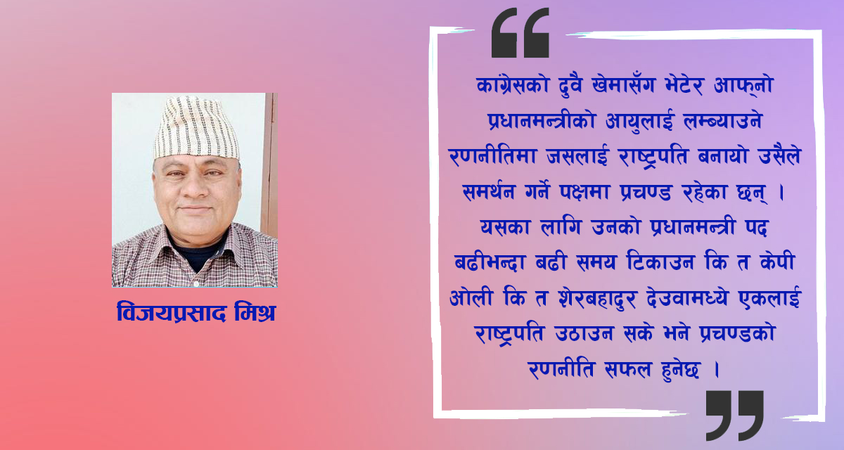 कांग्रेसको दुबै खेमासँग भेटेर आफ्नो प्रधानमन्त्रीको आयूलाई लम्याउने रणनीतिमा जसलाई राष्ट्रपति बनायो उसैले समर्थन गर्ने पक्षमा प्रचण्ड रहेका छन्। यसका लागि उनको प्रधानमन्त्री पद बढीभन्दा बढी समय टिकाउन कि त केपी ओलाी कि त शेरबहादुर देउवामध्ये एकलाई राष्ट्रपति उठाउन सकेभने प्रचण्डको रणनीति सफल हुने छ।