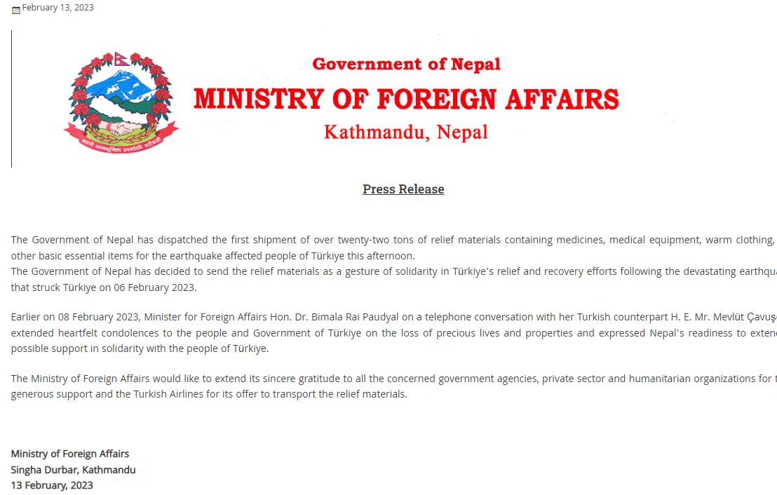 यसअघि ०८ फेब्रुअरी २०२३ मा परराष्ट्र मन्त्री  विमला राई पौड्यालले टर्कीका समकक्षी एच ई मिस्टरसँग टेलिफोन वार्ता गरेर नेपाल सरकारको तर्फवाट दु:ख ब्यक्त गरेकी थिइन्।