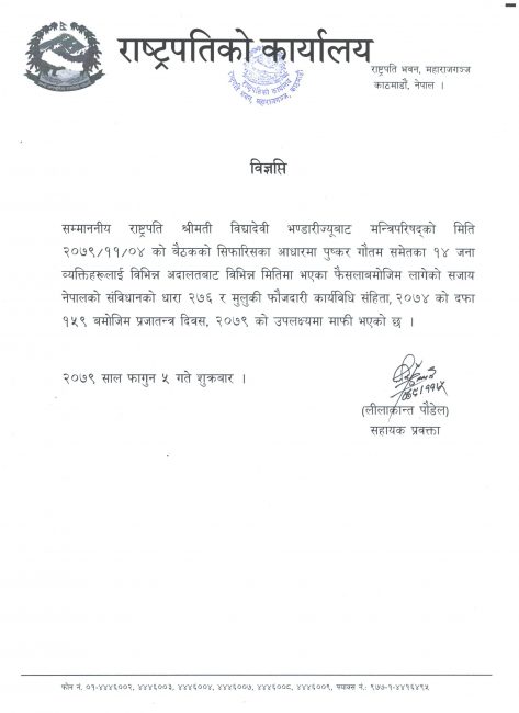 राष्ट्रपति भण्डारीबाट फागुन ४ गतेको बैठकको सिफारिसका आधारमा पुष्कर गौतमसमेतका १४ जना व्यक्तिलाई विभिन्न अदालतबाट विभिन्न मितिमा भएका फैसलाबमोजिम लागेको सजाय नेपालको संविधानको धारा २७६ र मुलुकी फौजदारी कार्यविधि संहिता, २०७४ को दफा १५९ बमोजिम प्रजातन्त्र दिवस, २०७९ को उपलक्ष्यमा माफी भएको राष्ट्रपतिको कार्यालयले जनाएको छ।