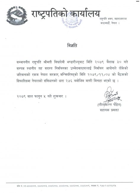 निर्वाचन आयोगले तोकेको जरिवाना राष्ट्रपतिद्वारा माफी मिनाहा