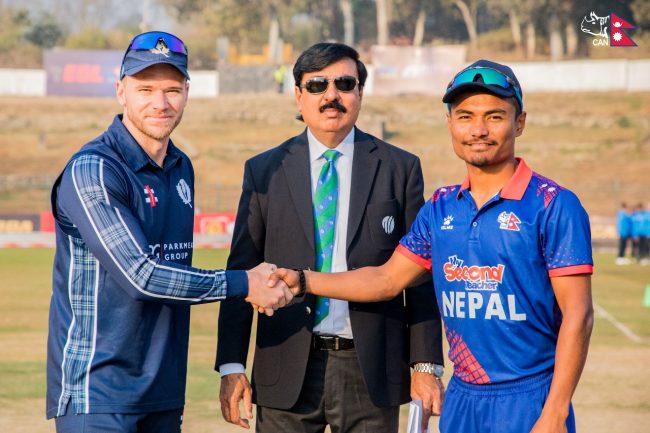 कीर्तिपुरस्थित त्रिभुवन अन्तर्राष्टिय त्रिकेट मैदानमा जारी खेलमा नेपालले टस जितेर पहिले फिल्डिङ रोजेको हो। यससँगै स्कटल्याण्डले अब पहिले ब्याटिङ गर्ने भएको छ।