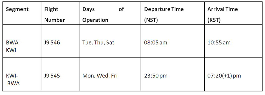 जजिराले भैरहवाबाट कुबेतका लागि मंगलबार, बिहीबार र शनिबार नेपाली समय अनुसार बिहान ८ः०५ बजे उडान भर्नेछ । कुवेतमा स्थानीय समय अनुसार बिहान १०ः५५ बजे अवतरण गर्ने छ। साथै, जजिरा एयरवेजले भैरहवादेखि कुवेतसम्म २८ हजार ८३६ रुपैयाँको विशेष प्रारम्भिक एकतर्फी उडान भाडा कायम गरेको समेत जनाएको छ ।