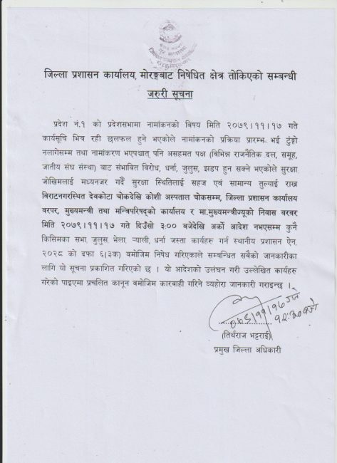 प्रजिअ भट्टराईले जारी गरेको सूचनामा प्रदेश १ को प्रदेश सभा नामकरणको प्रक्रिया प्रारम्भ भई टुङ्गो नलागेसम्म तथा नामाकरण भएपश्चात् पनि असहमत पक्ष (विभिन्न राजनीतिक दल, समूह, जातीय सङ्घसंस्था) बाट सम्भावित विरोध, धर्ना, जुलुस, झडप हुनसक्ने भएकाले निषेधाज्ञा गरेको उल्लेख छ।