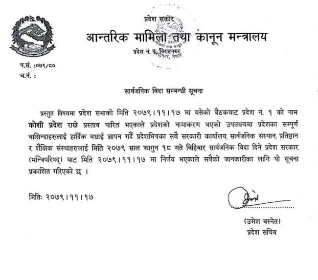 यसैबीच कोशी प्रदेश सरकारले आज सार्वजनिक बिदा दिने निर्णय गरेको छ। बुधबार साँझ प्रदेश सभाबाट प्रदेशको नामकरण भएको अवसरमा सार्वजनिक बिदा दिइएको हो।