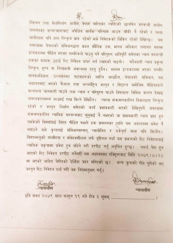 प्रधानमन्त्रीविरुद्ध रिट दर्ता गर्ने आदेशको लिखितः द्वन्द्वपीडितलाई न्यायिक प्रकियामा जान रोक्न नहुने तर्क