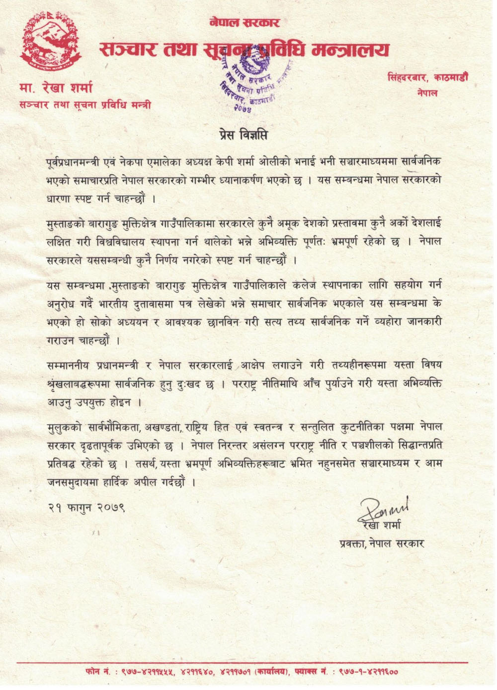 सरकारको प्रवक्तासमेत रहेकी मन्त्री शर्माले आज जारी गरेको प्रेस विज्ञप्तिमा मुस्ताङको बारागुङ मुक्ति क्षेत्र गाउँपालिकामा सरकारले कुनै अमुक देशको प्रस्तावमा कुनै अर्को देशलाई लक्षित गरी विश्वविद्यालय स्थापना गर्न थालेको भन्ने अभिव्यक्ति पूर्णतः भ्रमपूर्ण रहेको र सरकारले यससम्बन्धी कुनै निर्णय नगरेको स्पष्ट गर्न चाहेको उल्लेख छ।