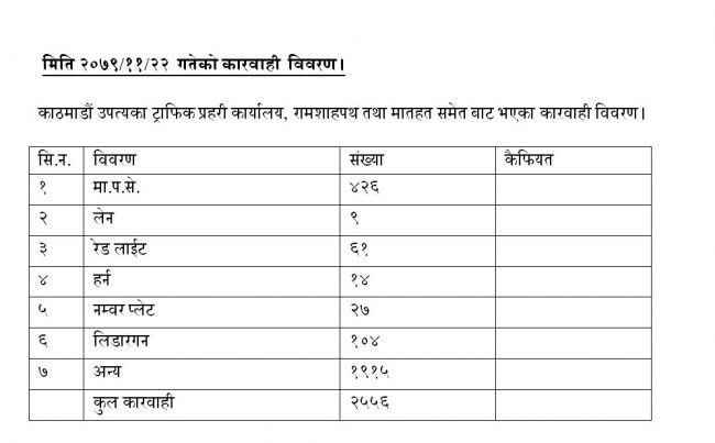 यसैगरी, रेड लाइट उलङघन गर्ने ६१, अनावश्यक हर्न बजाउने १४, स्पष्ट नदेखिने नम्बर प्लेटसहित हिड्ने २७, अत्याधिक गतिमा सबारी चलाउने (लिडार गन) १०४ र अन्य गरी १९९५ जनालाई कारबाही गरिएको ट्राफिक प्रहरी कार्यालयले जनाएको छ।