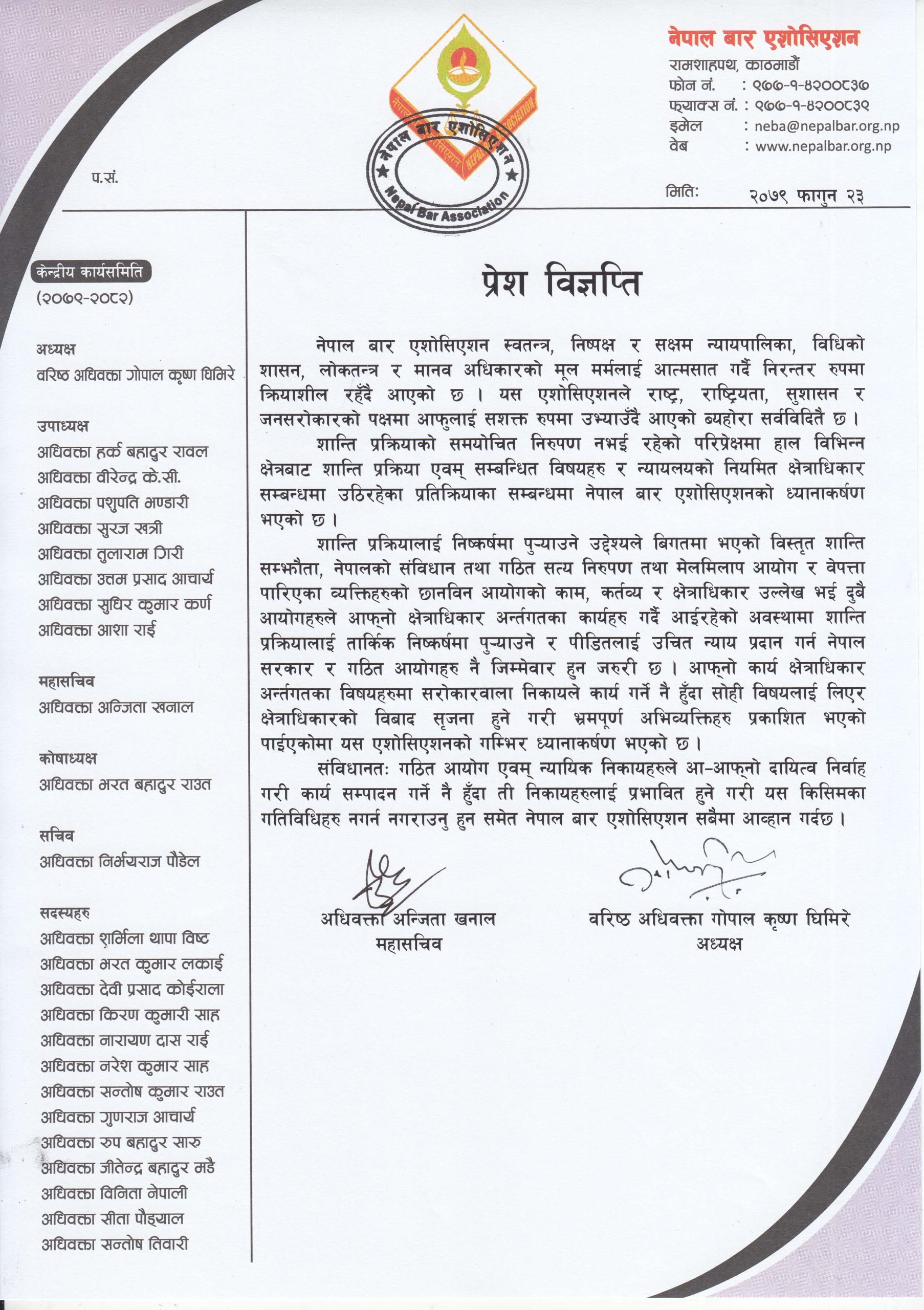 विज्ञप्तिमा भनिएको छ, “सङ्क्रमणकालीन न्याय निरुपण गर्न गठित आयोग एवं न्यायिक निकायले आ–आफ्नो दायित्व निर्वाह गरी कार्यसम्पादन गर्ने नै हुँदा ती निकायलाई प्रभावित हुने गरी यस किसिमका गतिविधि नगर्न÷नगराउनु हुनसमेत नेपाल बार एसोसिएसन सबैमा आह्वान गर्दछ।”