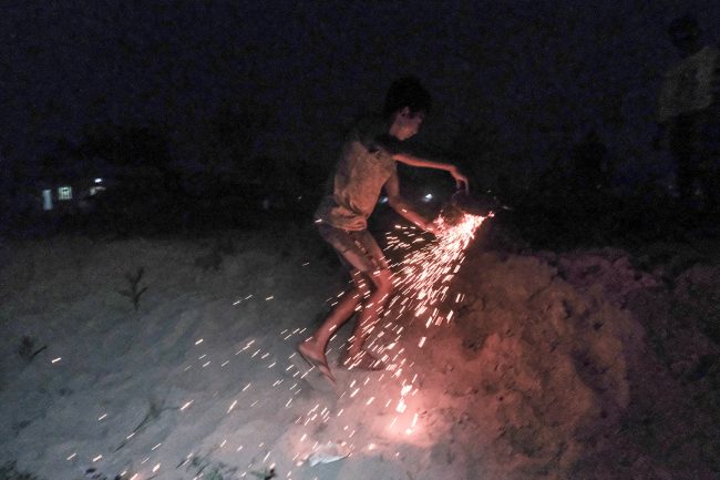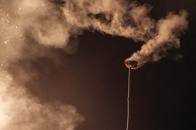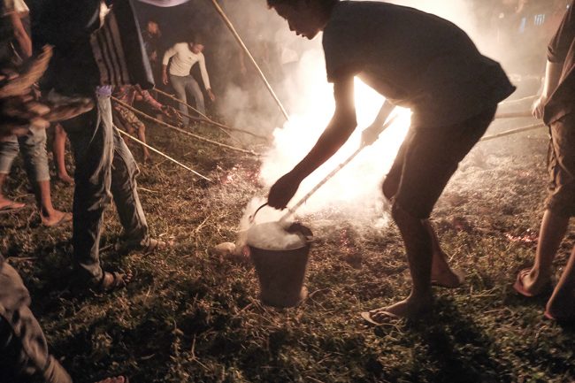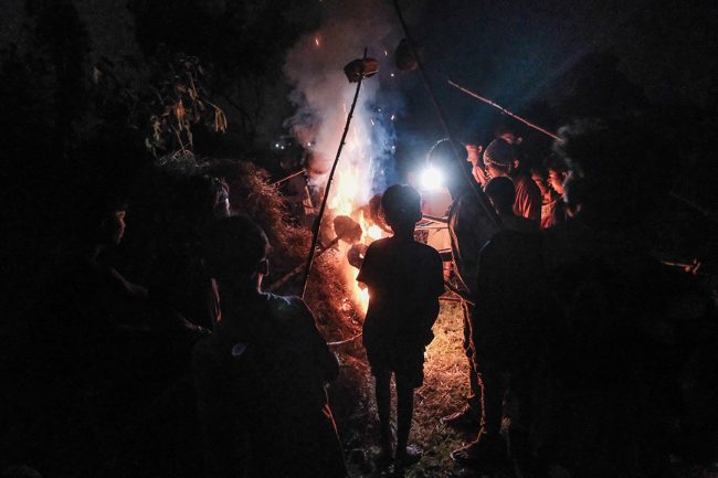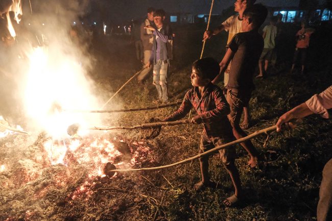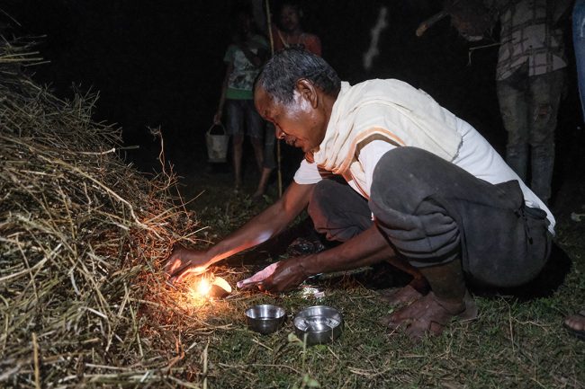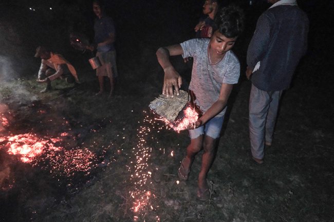 गुरुवाले आगो बाल्ने बित्तिकै घर-घरका युवा केटाहरू सुकेको गोबरको गुइँठो बोकेर खेतमा आइपुग्छन्। कतिपय केटाहरूले गुइँठोलाई स्टीलको बाल्टिनमा बोक्छन् भने अरूले लामो काठको लट्ठीले बोक्छन्। केटाहरू जलिरहेको परालको थुप्रोमा गुइँठो बाल्छन् र नयाँ आगो आफ्नो घरमा लैजान्छन्।