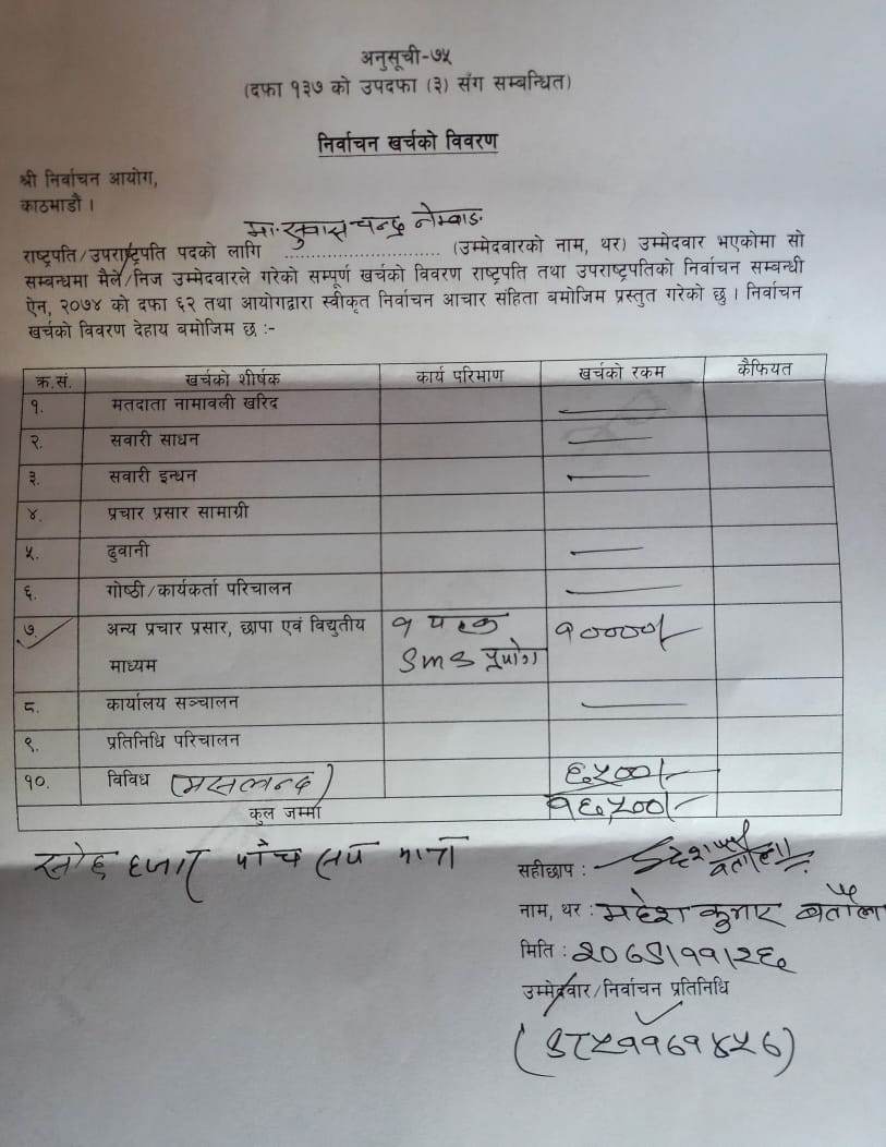 राष्ट्रपति निर्वाचनमा सुवास नेम्वाङको खर्च कति ?