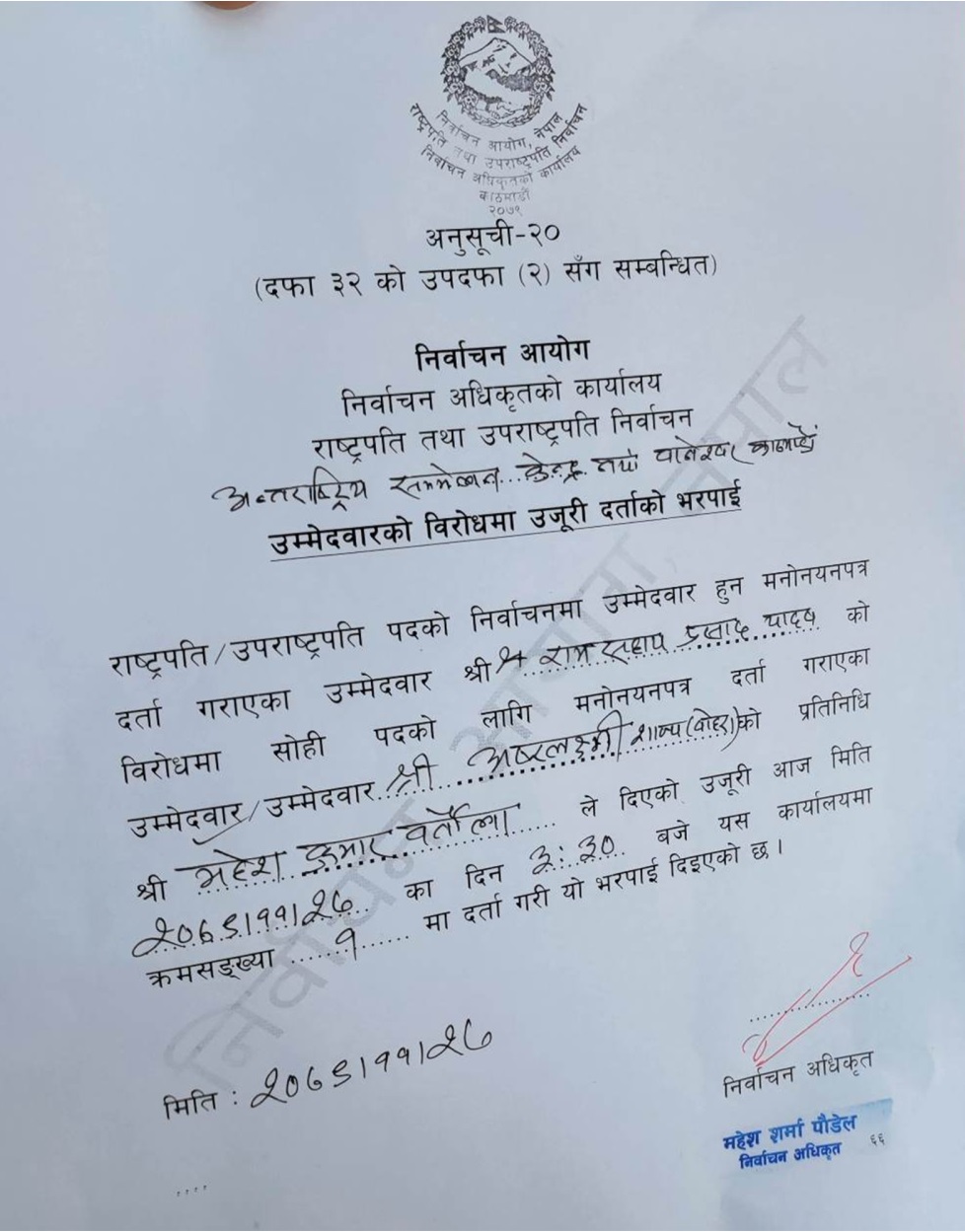 उपराष्ट्रपतिका उम्मेदवार रामसहाय यादवविरुद्ध उजुरी दर्ता