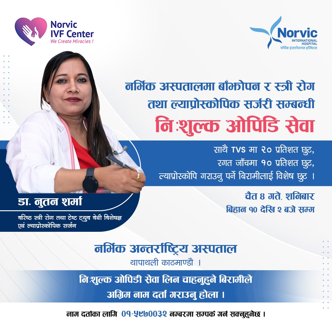 निसन्तानसम्बन्धी समस्या भएका र दुरविन पद्दतीबाट स्त्रीरोग सम्बन्धमा शल्यक्रिया गर्न चाहने तथा अन्य कुनै स्त्रीरोग सम्बन्धी समस्या भएका बिरामीलाई लक्षित गर्दै हस्पिटलले निशुल्क ओपिडी सेवा सञ्चालन गर्न लागेको हो। नर्भिक हस्पिटलकी बरिष्ठ स्त्री रोग तथा टेष्टट्युव वेवी बिशेषज्ञ एवम् ल्याप्रोस्कोपिक सर्जन डा. नुतन शर्मासहितको टोलीले निशुल्क ओपिडी सेवा सञ्चालन गर्नेछ।