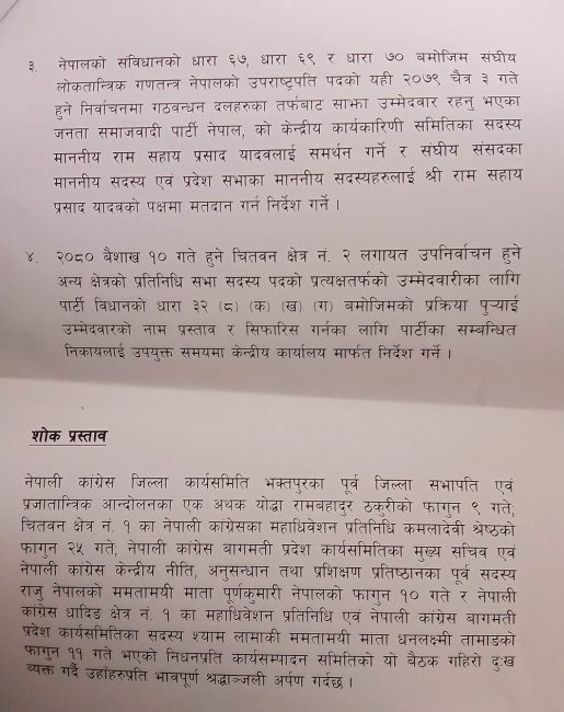 उनले भने, ‘उपराष्ट्रपति पदको यही २०७९ चैत्र ३ गते हुने निर्वाचनमा गठवन्धन दलहरुका तर्फबाट साझा उम्मेदवार रहनु भएका जनता समाजवादी पार्टीको केन्द्रीय कार्यकारिणि समिति सदस्य रामसहाय प्रसाद यादवलाई समर्थन गर्ने र संघीय संसदका माननीय सदस्य एवं प्रदेश सभाका माननीय सदस्यहरुलाई यादवकै पक्षमा मतदान गर्न निर्देश गरेको छ।’