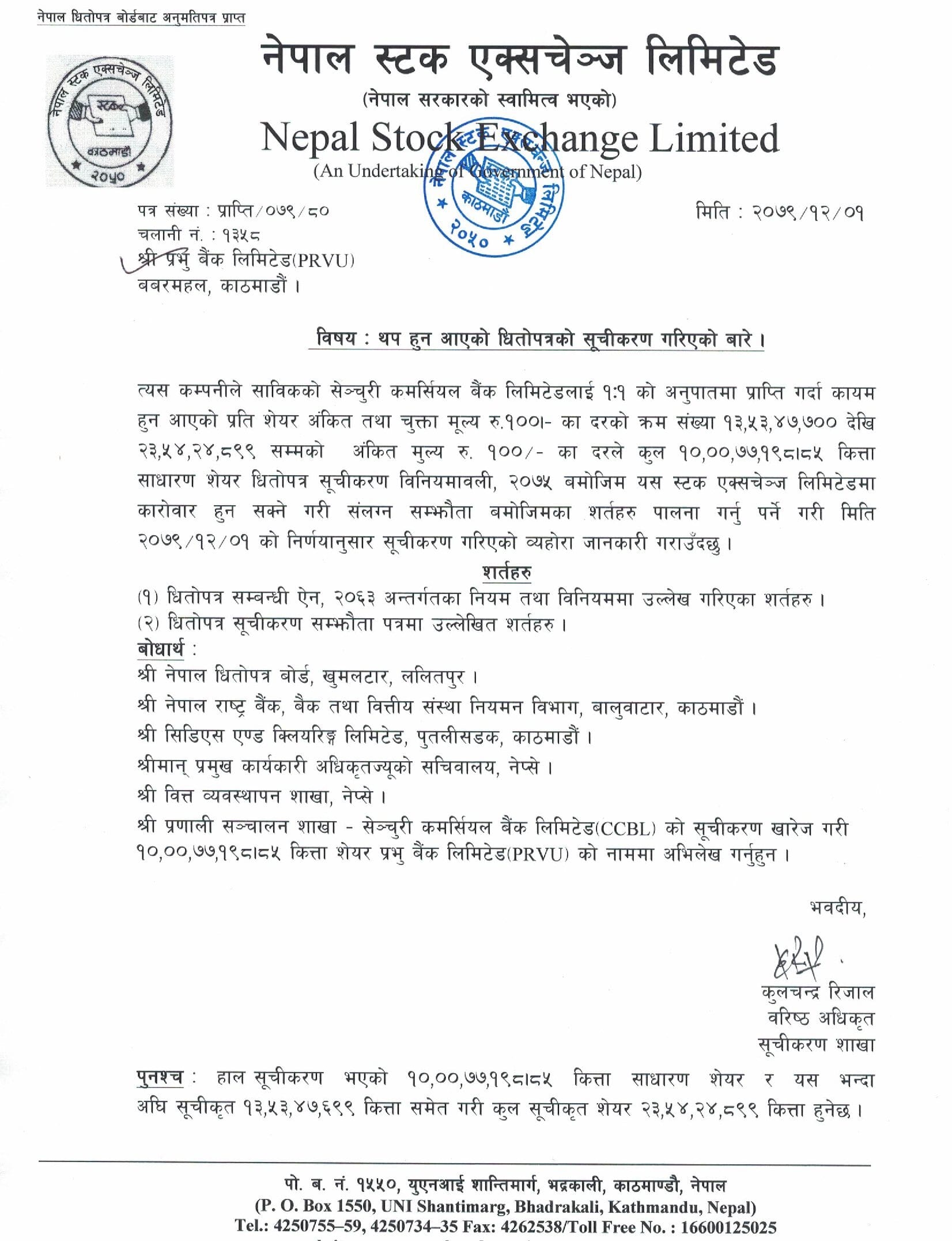 प्रभु बैंकको नाममा १० करोड कित्ताबढी सेयर सुचिकृत