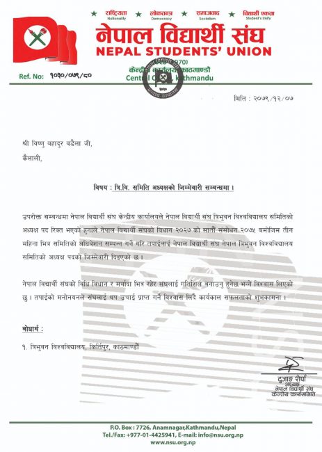 नेविसंघ त्रिवि समितिको अध्यक्ष पद रिक्त रहेकाले संगठनको विधान २०२७ को सातौं संशाेधन २०७५ बमोजित तीन महिना भित्र समितिको त्रिवि अधिवेशन सम्पन्न गर्ने गरि वडैलालाई जिम्मेवारी दिइएको उनले बताए।