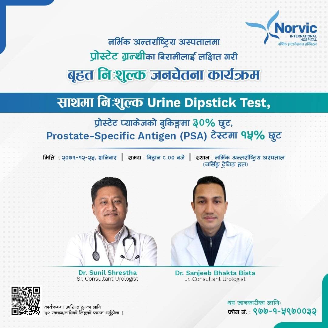 कार्यक्रममा सहभागीले वरिष्ठ यूरोलोजीस्ट डा. सुनिल श्रेष्ठ र यूरोलोजिष्ट डा. सञ्जिवभक्त बिष्ट नेतृत्वको टिमबाट निःशुल्क परामर्श सेवा तथा जाँचको सुविधा पाउनेछन्।