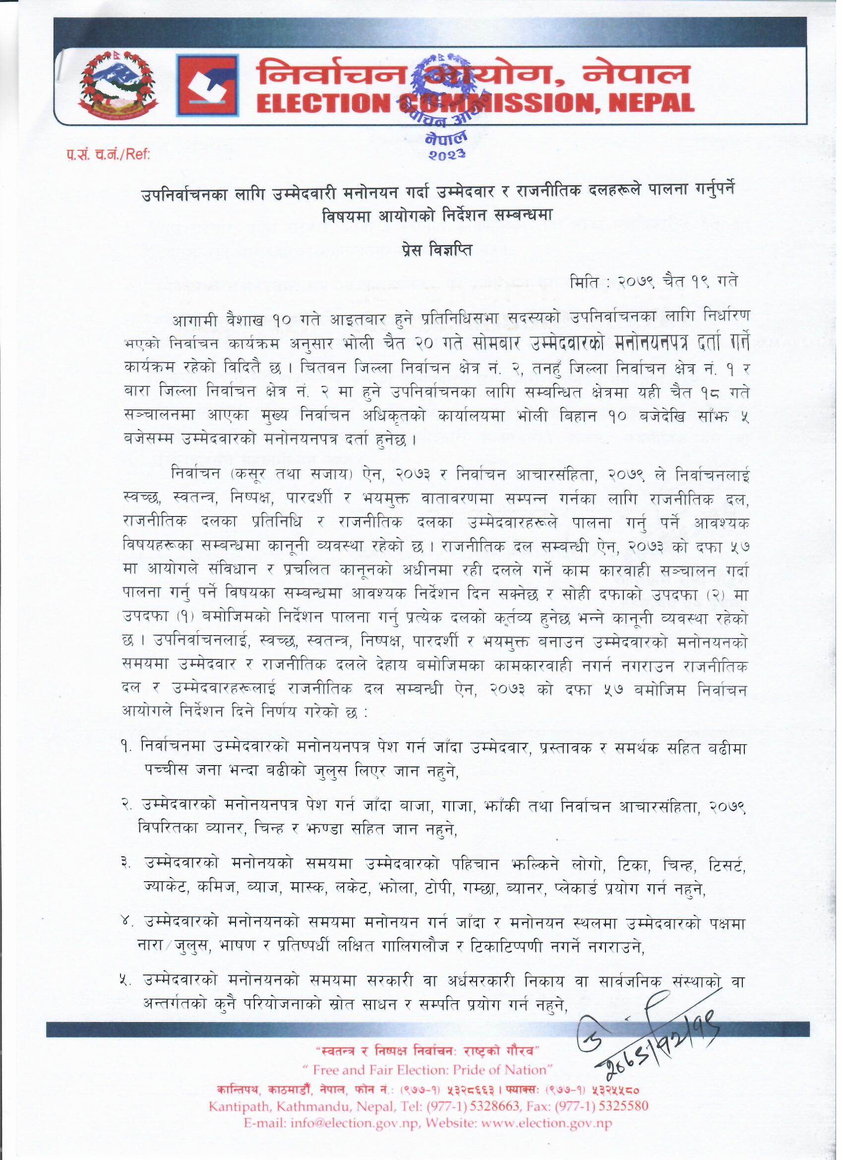 आयोगद्वारा जारी निर्देशनअनुसार निर्वाचनमा उम्मेदवारको मनोनयनपत्र पेश गर्नजाँदा उम्मेदवार, प्रस्तावक र समर्थकसहित बढीमा २५ जना भन्दा बढीको जुलुस लिएर जान नहुने भनिएको छ।