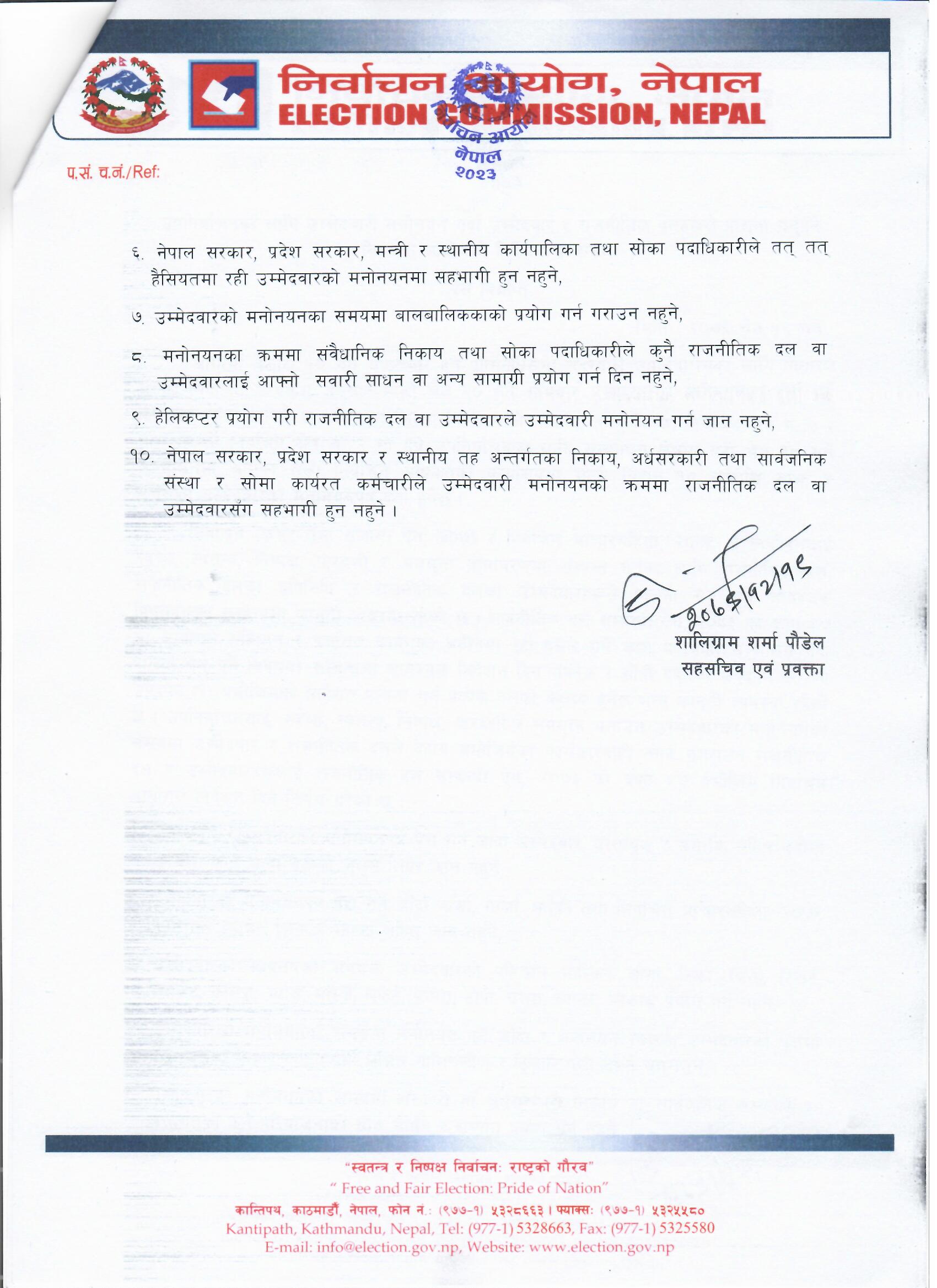 त्यस्तै, मनोनयनको समयमा सरकारी वा अर्धसरकारी निकाय वा सार्वजनिक संस्थाको वा अन्तर्गतको कुनै परियोजनाको स्रोत साधन र सम्पति प्रयोग गर्न नहुने आयोगले जनाएको छ।