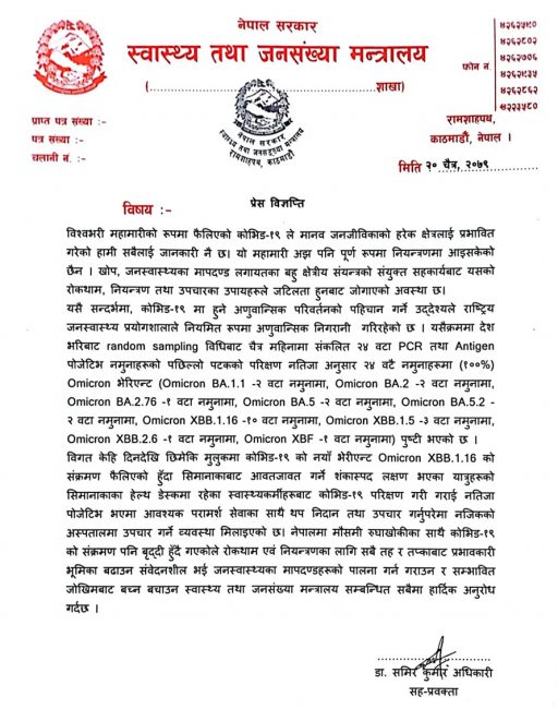 भारतमा पनि नयाँ भेरियन्ट फैलिरहेको हुँदा सीमा क्षेत्रमा कोरोना परीक्षण, मास्क अनिवार्य जस्ता व्यवस्था गरेको मन्त्रालयले जनाएको ।