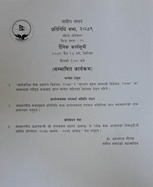 साथै दोस्रो नम्बरमा सभामुख देवराज घिमिरेले प्रतिनिधिसभा कार्यव्यवस्था परामर्श समितिका लागि सदस्यहरुको नाम मनोनयन गर्ने र तेस्रो नम्बरमा प्रधानमन्त्री श्री पुष्पकमल दाहाल प्रचण्डले लोक सेवा आयोगको ६३औँ वार्षिक प्रतिवेदन पेस गर्ने उल्लेख छ।