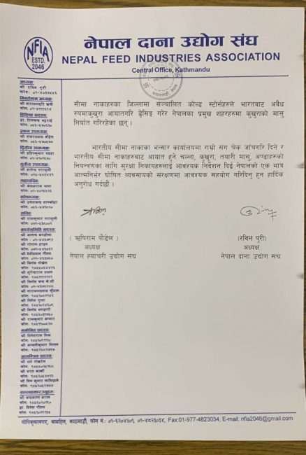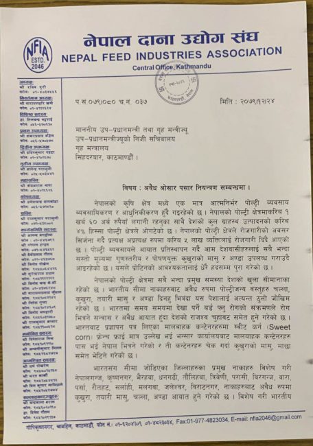 भारतमा समय समयमा देखा पर्ने बर्ड फ्लु रोगको संक्रमणले रोग मित्रने सन्त्रास र अवैध आयात हुँदा देशको राजश्व चुहावट समेत हुने गरेको उल्लेख छ। भारतबाट प्रज्ञापन पत्र लिएका मालबाहक कन्टेनरहरुमा स्वीट कर्न, फ्रेन्च फ्राई मात्र उल्लेख भई भन्सार कार्यालयबाट पास भएमा मालबाहक कन्टेनरमा कुखुराको मासु, माछा भेटिने गरेको भन्दै उनीहरूले नाकामा कडाई गर्न आग्रह गरेका हुन्। नेपालगन्ज, कृष्णनगर, भैरहवा, धनगढी, तौलिहवा, त्रिवेणी, परासी, विरगन्ज, वारा, पर्सा, रौतहट, सर्लाही, मलगवा, जलेश्वर, विराटनगर नाकाहरुबाट अवैध रुपमा कुखुरा, तयारी मासु, चल्ला, अण्डा आयात हुने गरेको उनीहरूको दाबी छ।