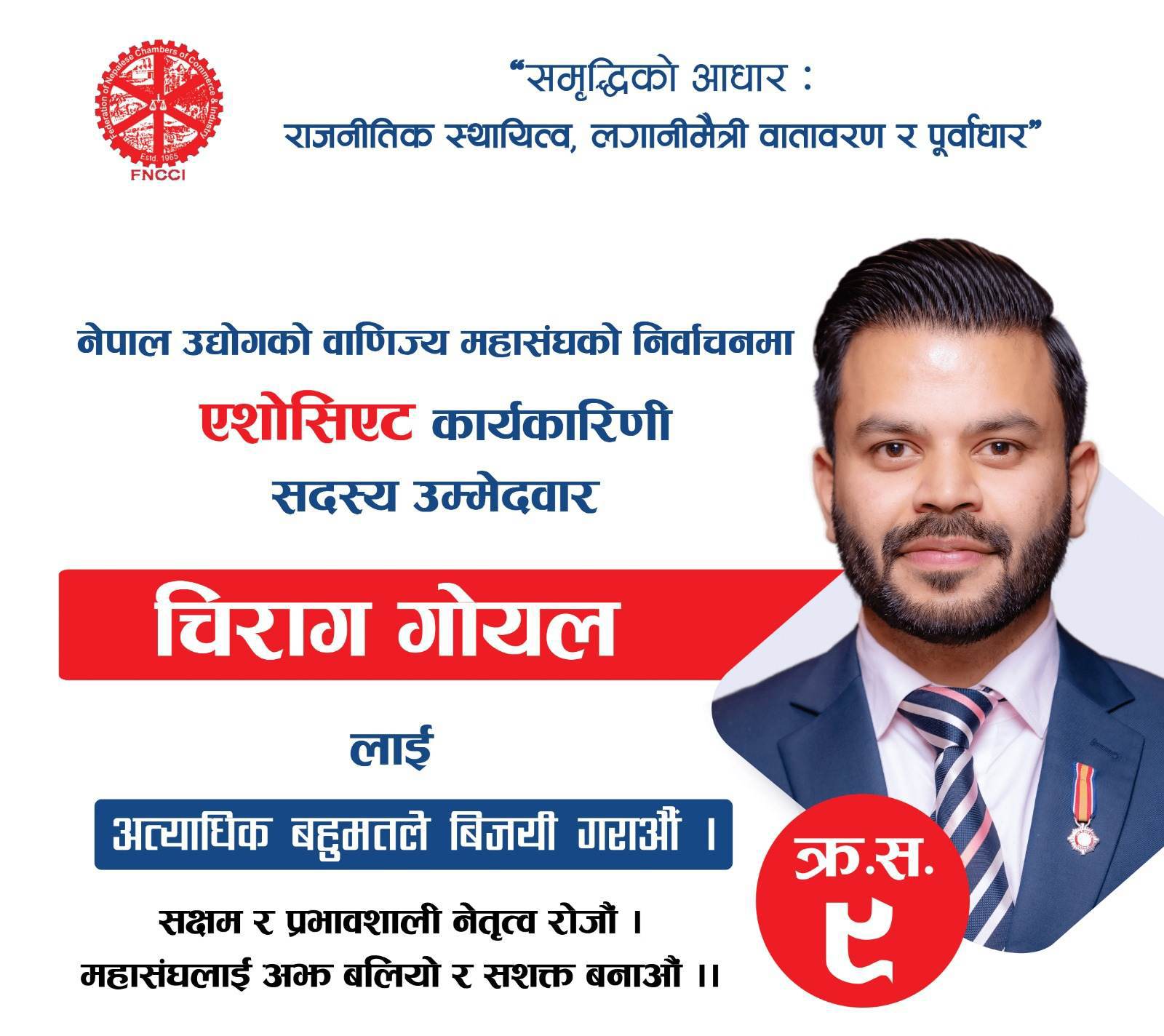 काठमाडौँ। एफएनसीसीआईको निर्वाचनका लागि महासंघ एशाेसिएट तर्फबाट केन्द्रीय सदस्यमा गोयल ग्रुपका कार्यकारी निर्देशक चिराग गोयलले उम्मेदवारी दिएका छन्।