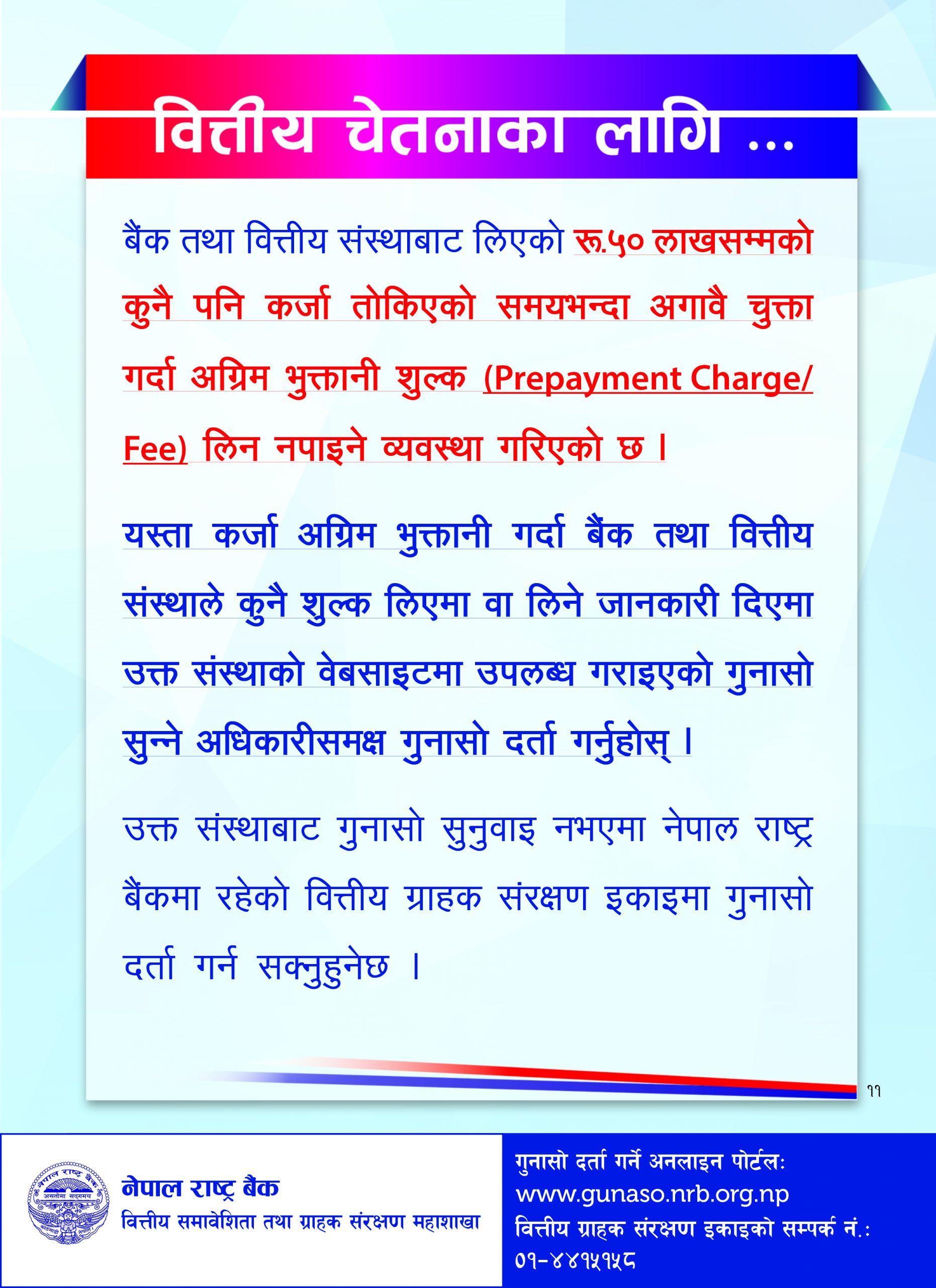 नेपाल राष्ट्र बैंकले यस्ता कर्जा अग्रिम भुक्तानी गर्दा बैंक तथा वित्तीय संस्थाले कुनै शुल्क लिएमा वा लिने जानकारी दिएमा गुनासो दर्ता गर्न आग्रह गरेको छ।