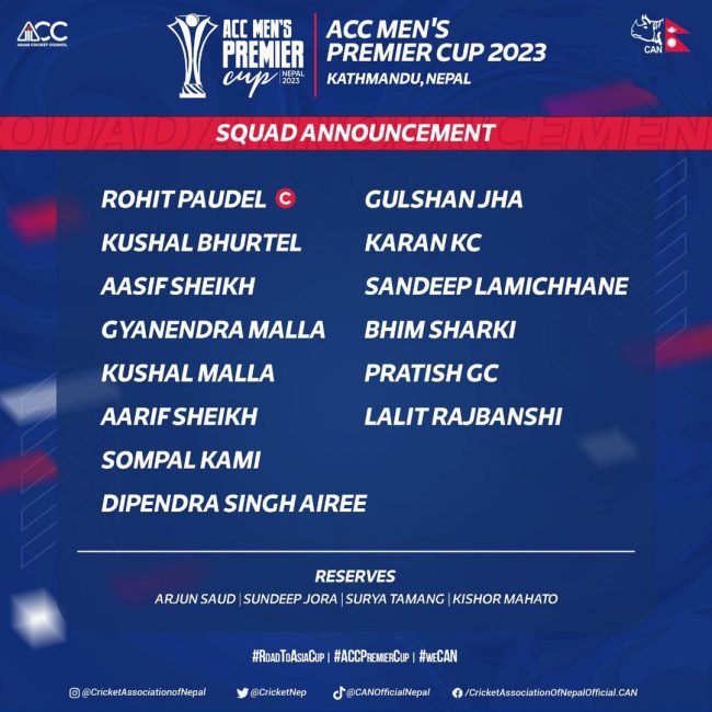 काठमाडौं। नेपाल क्रिकेट संघ (क्यान)ले एसीसी प्रिमियर कप खेल्ने १४ सदस्यीय टोलीको घोषणा गरेको छ। क्यानले ओमानसँगको अभ्यास खेलपछि रोहित पौडेलको कप्तानीमा अन्तिम १४ सदस्यीय टोली घोषणा गरेको हो।