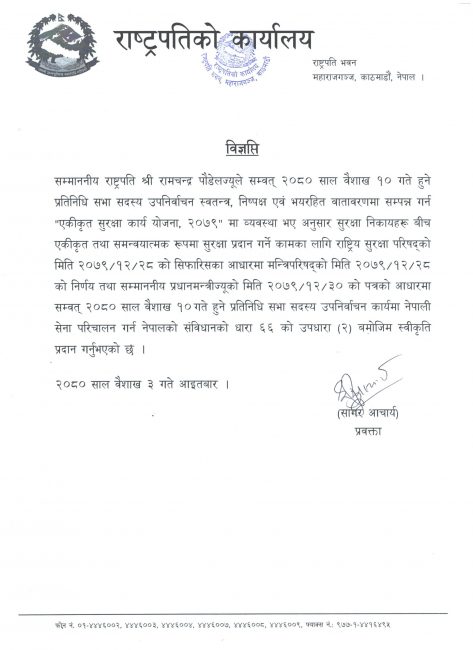 राष्ट्रपति कार्यालयका प्रवक्ता सागर आचार्यद्वारा जारी प्रेस विज्ञप्तिमा भनिएको छ, ‘‘सम्माननीय राष्ट्रपति श्री रामचन्द्र पौडेलज्यूले सम्वत् २०८० साल वैशाख १० गते हुने प्रतिनिधि सभा सदस्य उपनिर्वाचन स्वतन्त्र, निष्पक्ष एवं भयरहित वातावरणमा सम्पन्न गर्न “एकीकृत सुरक्षा कार्य योजना, २०७९” मा व्यवस्था भए अनुसार सुरक्षा निकायहरूबीच एकीकृत तथा समन्वयात्मक रूपमा सुरक्षा प्रदान गर्ने कामका लागि राष्ट्रिय सुरक्षा परिषद्को मिति २०७९।१२।२८ को सिफारिसका आधारमा मन्त्रिपरिषद्को मिति २०७९।१२।२८ को निर्णय तथा सम्माननीय प्रधानमन्त्रीज्यूको मिति २०७९।१२।३० को पत्रको आधारमा सम्वत् २०८० साल वैशाख १० गते हुने प्रतिनिधि सभा सदस्य उपनिर्वाचन कार्यमा नेपाली सेना परिचालन गर्न नेपालको संविधानको धारा ६६ को उपधारा २ बमोजिम स्वीकृति प्रदान गर्नुभएको छ ।’’