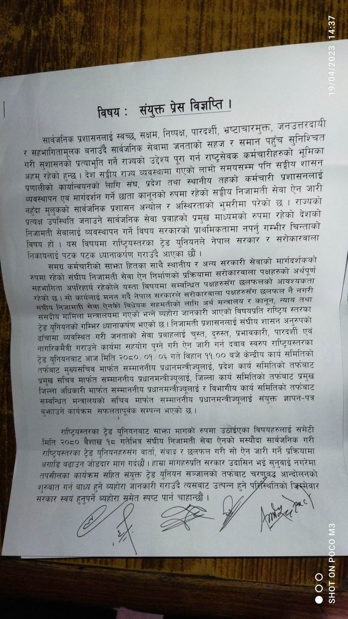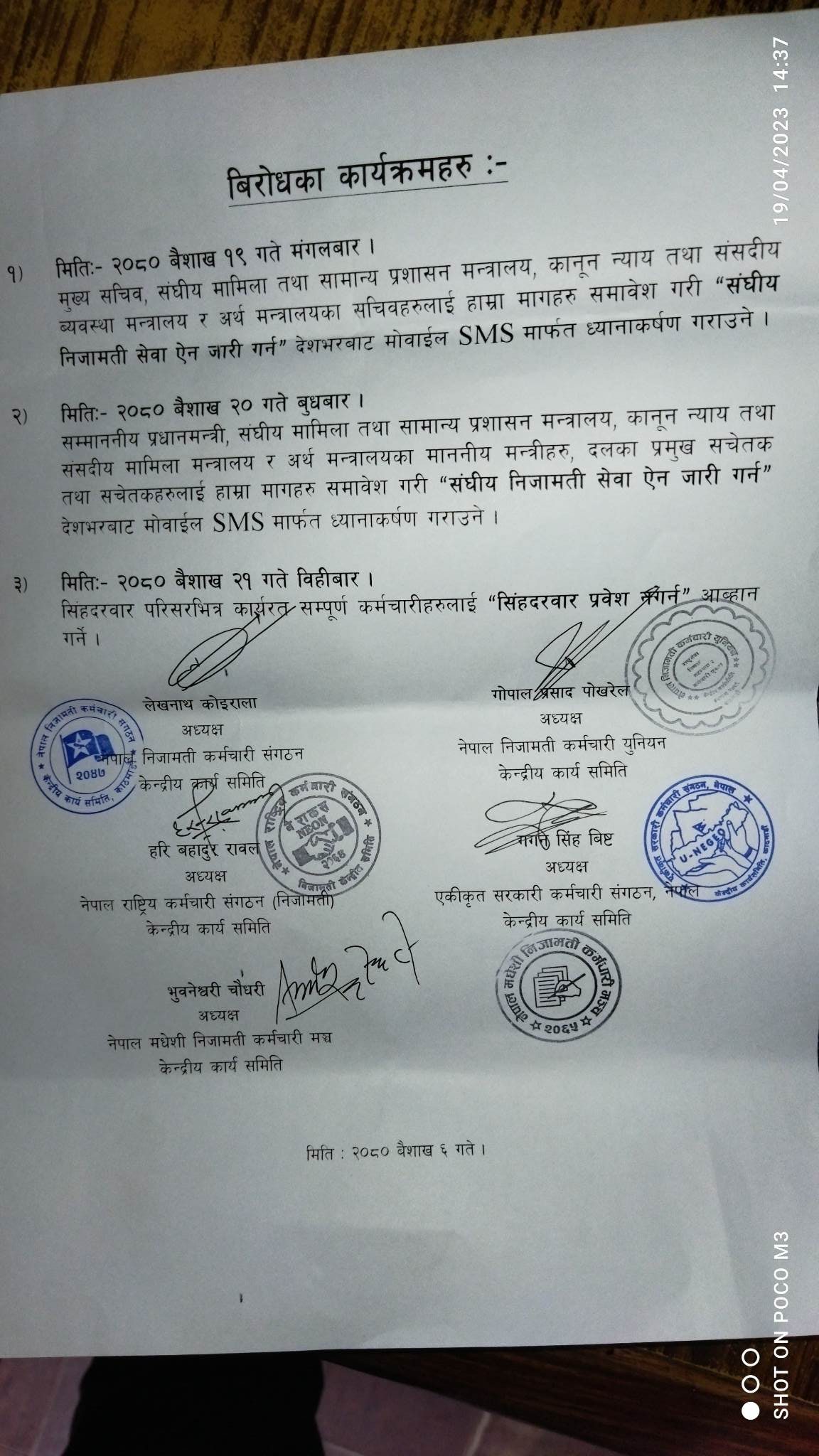 यस्तै, नेपाल निजामती कर्मचारी युनियन केन्द्रीय कार्यसमितिका अध्यक्ष गोपालप्रसाद पोखरेलले आफूहरुले ७७ वटै जिल्लाका सञ्जालमार्फत माग पूरा गराउन सरोकारवालाहरुलाई ज्ञापनपत्र बुझाएको सुनाए।