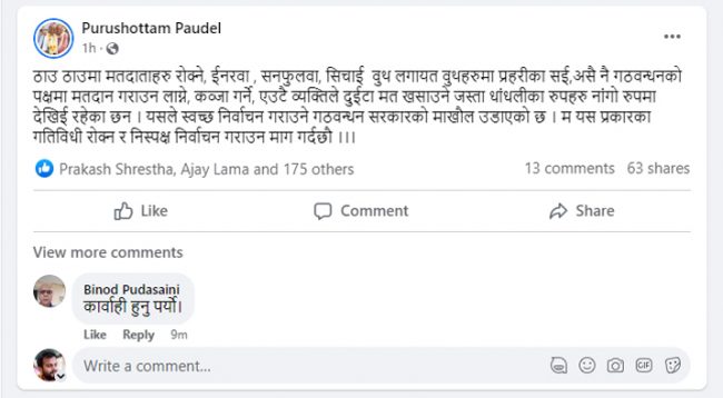 उनले सामाजिक सञ्जाल फेसबुकमा स्टाटस लेख्दै भनेका छन ठाउँ ठाउँमा मतदाताहरु रोक्ने, ईनरवा, सनफुलवा, सिचाई वुथ लगायतका वुथहरुमा प्रहरीका सई र असइ नै गठवन्धनको पक्षमा मतदान गराउन लाग्ने गरेको भन्दै कब्जा गर्ने, एउटै व्यक्तिले दुईटा मत खसाउने जस्ता धाँधलीका रुपहरु नागो रुपमा देखिई रहेको बताएका छन् ।