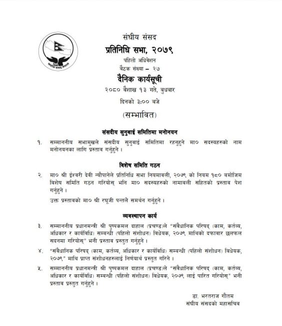 आजको सम्भावित कार्यसूचीमा उल्लेख भए अनुसार संबैधानिक परिषद सबन्धी बिधेयक आजै पारित गरिनेछ। प्रधानमन्त्री पुष्पकमल दाहाल प्रचण्डले संबैधानिक परिषद (काम, कर्तब्य, अधिकार र कार्यबिधि) संबन्धी पहिलो संसोधन बिद्येयक २०७९ माथिको दफाबार छलफल गरियोस भन्ने प्रस्ताव प्रस्तुत गर्ने सम्भावित कार्यसूची रहेको छ।