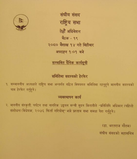बैठकमा विषयगत समिति सदस्यकाे नाम हेरफेर गरिनेसहितकाे सम्भावित कार्यसूची सार्वजनिक गरिएकाे छ।