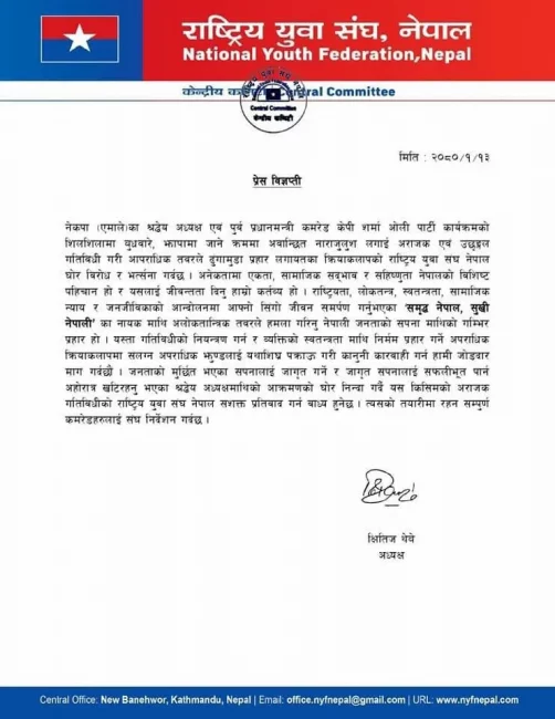 युवा संघले अध्यक्ष ओलीमाथिको आक्रमणको घोर निन्दा गर्दै उक्त किसिमको अराजक गतिविधिको सशक्त प्रतिवाद गर्न बाध्य हुने चेतावनीसमेत दिएको छ।