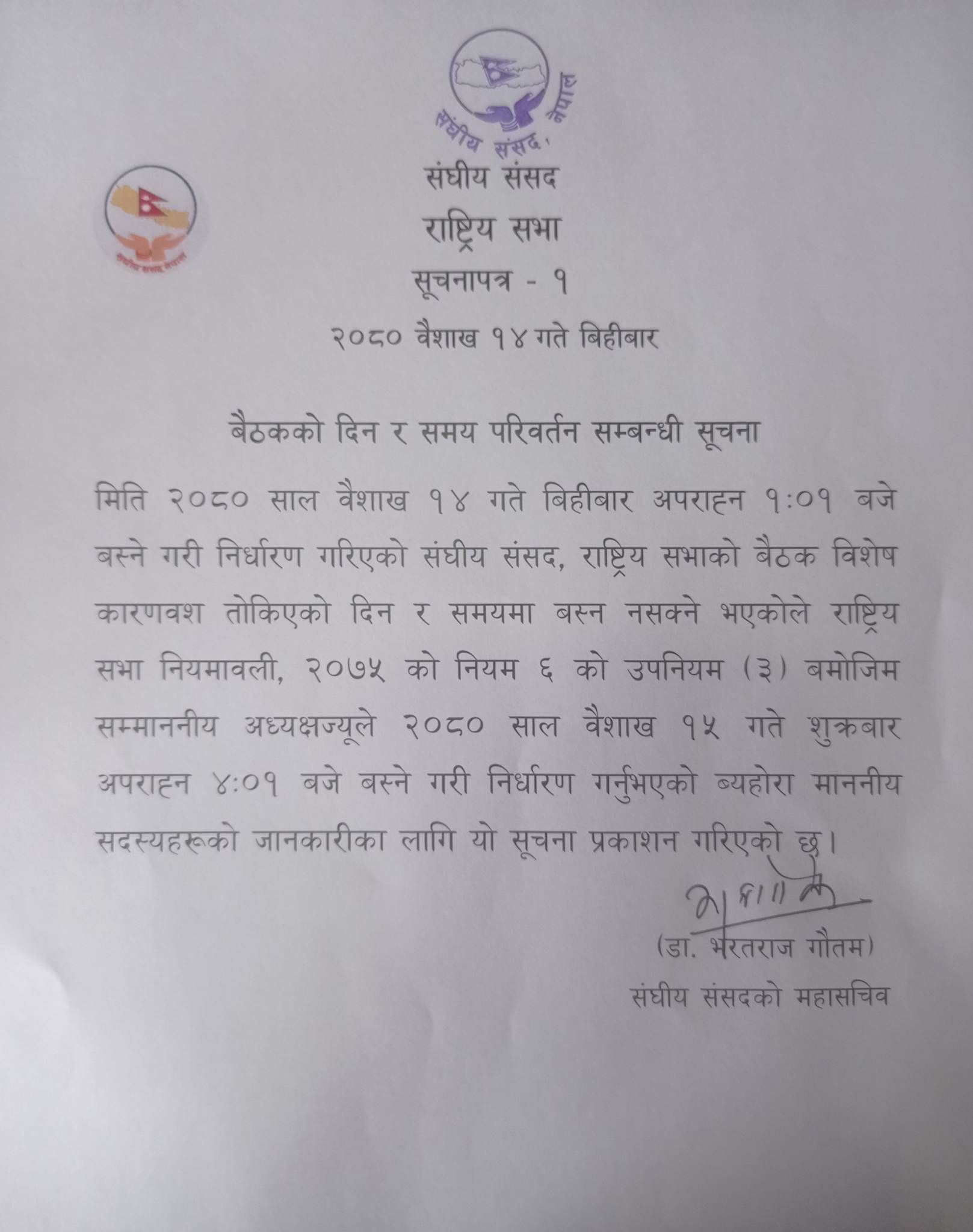 आज बस्ने गरी निर्धारण गरिएको बैठक विशेष कारणवश तोकिएको दिन र समयमा बस्न नसक्ने भएकाले राष्ट्रियसभा नियमावली, २०७५ को नियम (६) उपनियम (३) बमोजिम अध्यक्ष गणेशप्रसाद तिमिस्सिनाले शुक्रबार बस्ने गरी निर्धारण गरेको सङ्घीय संसद्का महासचिव डा भरतराज गौतमले जानकारी दिए।