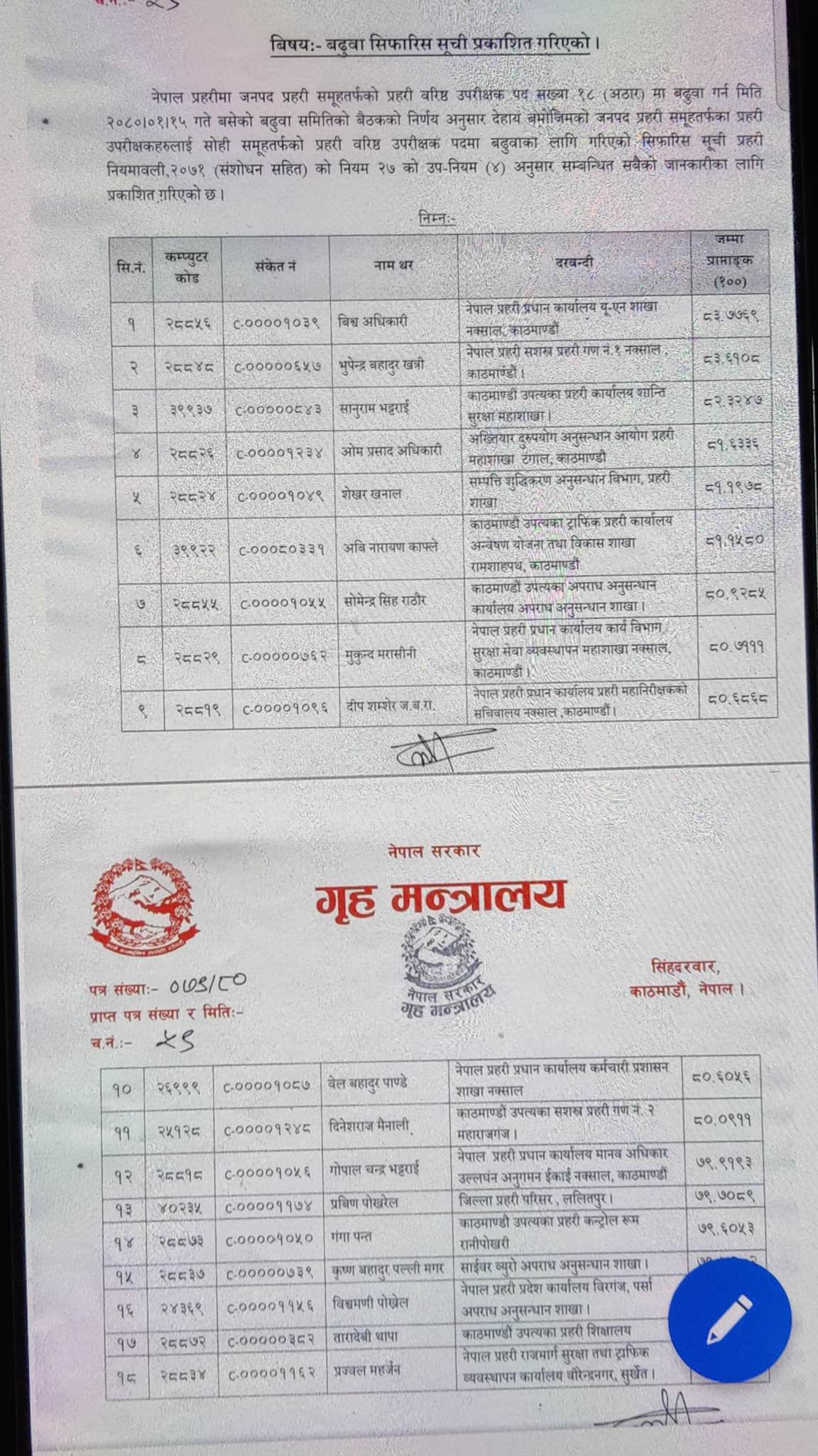 काठमाडौंं । गृह मन्त्रालयले नेपाल प्रहरीमा रिक्त १८ प्रहरी वरिष्ठ उपरीक्षक (एसएसपी) पदमा बढुवा सिफारिस गरेको छ।