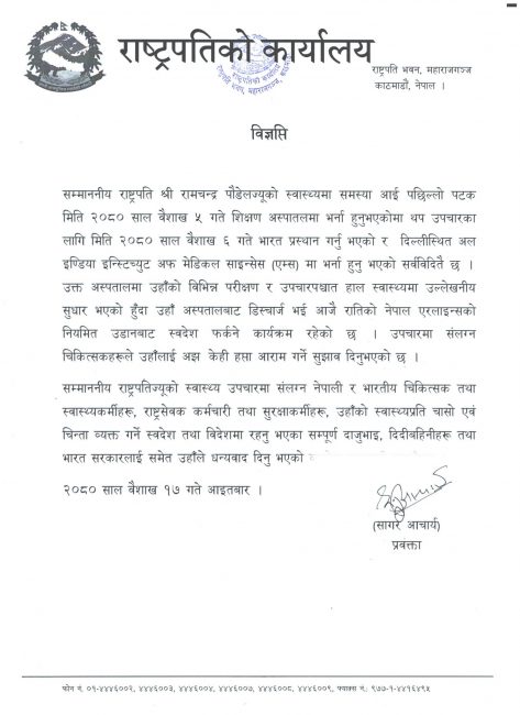 स्वास्थ्यमा समस्या देखिएपछि राष्ट्रपति पौडेल  श्री एअरकाे  एअर एम्बुलेन्सबाट वैशाख ६ गते बुधबार भारतको नयाँ दिल्ली गएका थिए। स्वास्थयमा सुधार भएपछि राष्ट्रपति आजै डिस्चार्ज भएका थिए। डिस्चार्ज भएकै दिन राष्ट्रपति पौडेल स्वदेश फर्किन लागेका हुन्।