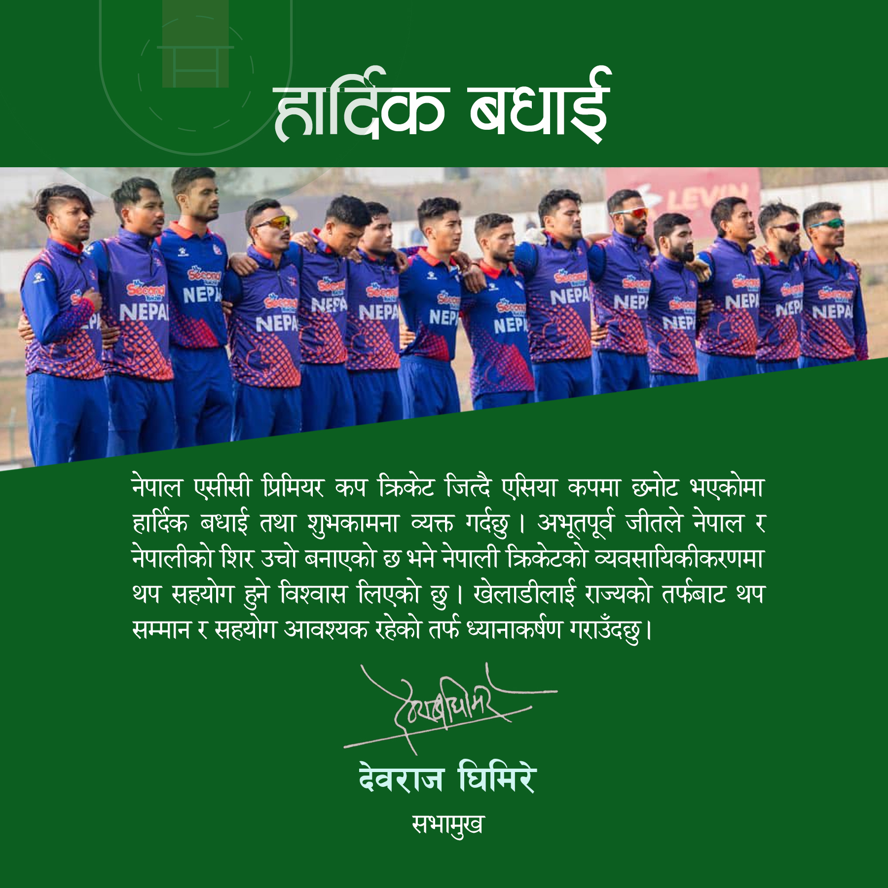 ‘नेपाल एसीसी प्रिमियम कप क्रिकेट जित्दै एसिया कपमा छनौट भएकोमा हार्दिक बधाई तथा शुभकामना,’ सभामुख घिमिरेले बधाई दिँदै भनेका छन्, ‘अभुतपुर्व जीतले नेपाल र नेपालीको शिर उचोा बनाएको छ भने नेपाली क्रिकेटको व्यवसायीकरणमा थप सहयोाग हुने विश्वास लिएको छु। खेलाडीलाई राज्यको तर्फवाट थप सम्मान र सहयोग आवाश्यक रहेको तर्फ ध्यानाकर्षण गराउँदछु।’