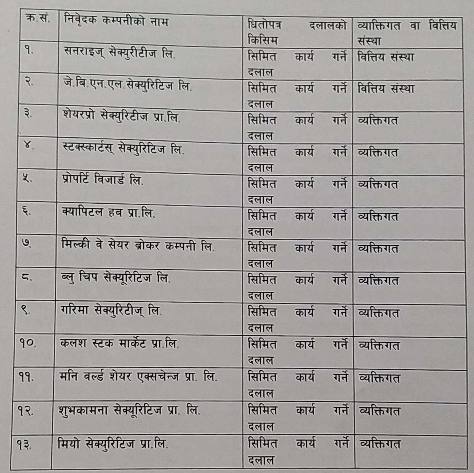 यस्तै, क्यापिटल हब, मिल्की वे सेयर ब्रोकर, ब्लुचिप सेक्युरिटिज, गरिमा सेक्युरिटिज, कलश स्टक मार्केट, मनी वर्ल्ड सेयर एक्सचेन्ज, शुभकामना सेक्युरिटज र मियो सेक्युरिटिजले पनि आशयपत्र पाएका छन्।