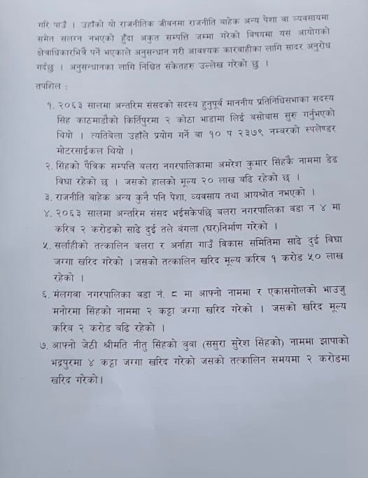 अकुत सम्पत्ति आर्जन गरेको भन्दै सिंहविरुद्ध सोमबार आयोगमा भ्रष्टाचारको मुद्दा दर्ता भएको हो। विकास ठाकुरले सोमबार उनीविरुद्ध भ्रष्टाचारको मुद्दा दर्ता गरेका हुन्।