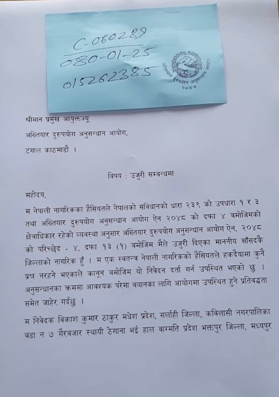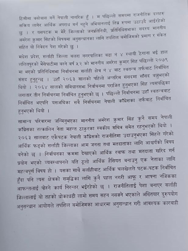 काठमाडौँ। प्रतिनिधिसभा सदस्य अमरेशकुमार सिंहविरुद्ध अख्तियार दुरुपयोग अनुसन्धान आयोगमा उजुरी परेको छ।