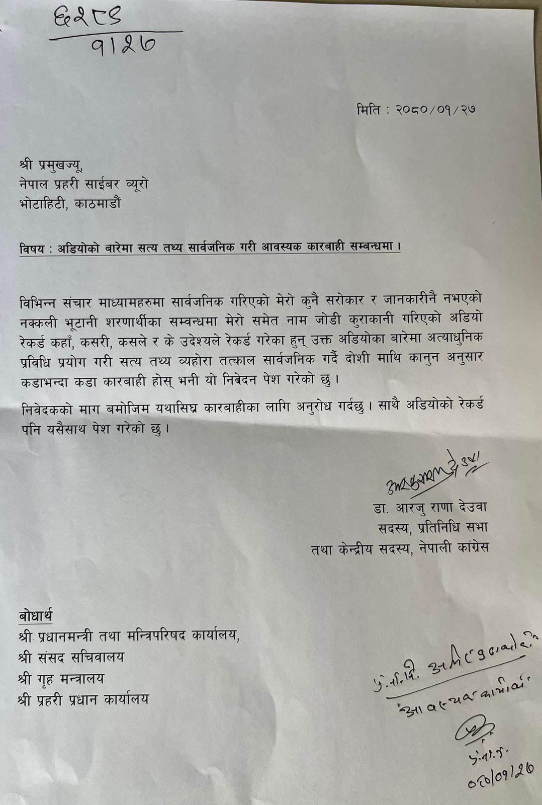 उनले आफ्नो निवेदनको बोधार्थमा प्रधानमन्त्री तथा मन्त्रिपरिषद कार्यालय, संसद सचिवालय, गृह मन्त्रालय र प्रहरी प्रधान कार्यालयको नाम राखेकी छन्।