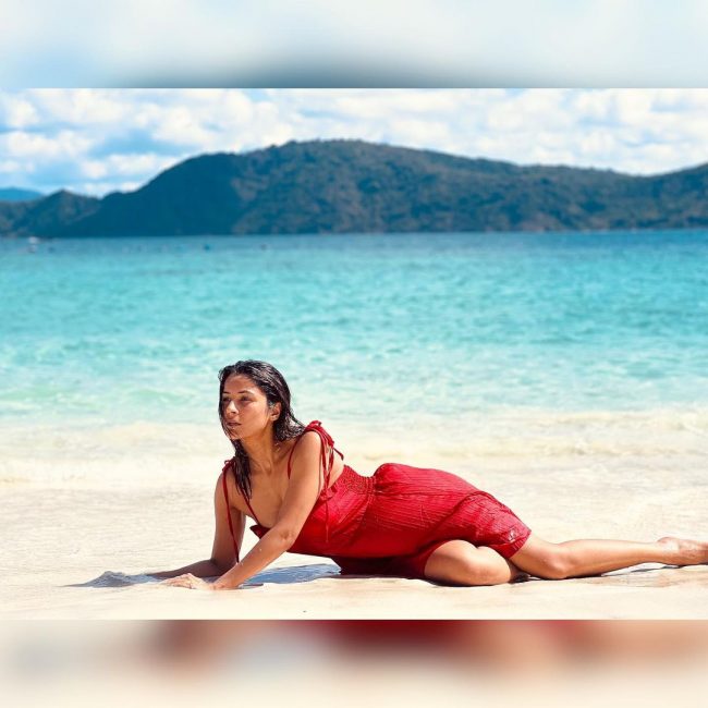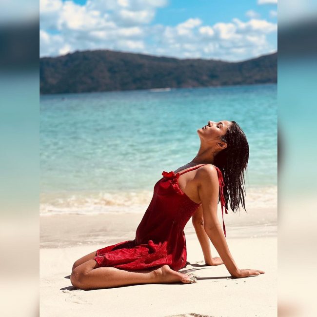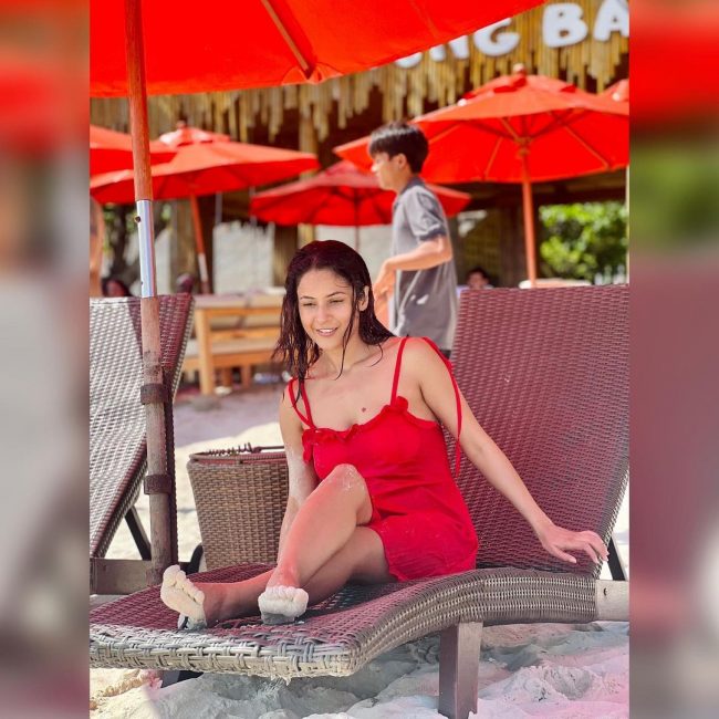 समुन्द्री किनारमा शहनाजले लगाइन् रातो सर्ट ड्रेस, दिइन् किलर पोज