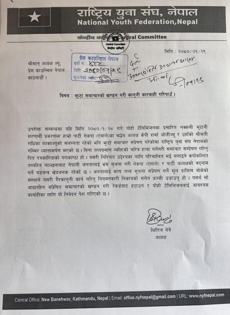 युवासंघले विना कुनै तथ्य प्रमाणका आधारमा अध्यक्ष ओली र उनकी श्रीमतीको संलग्नता रहेको भन्दै झुटो समाचार सम्प्रेषण गरेको भन्दै आपत्ति जनाएको थियो।