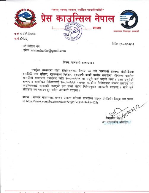 उक्त उजुरीप्रति प्रेस काउन्सिलले योहो टेलिभिनजलाई जानकारी गराएको थियो। पछि योहो टेलिजिभनले खण्डन प्रशारण गरी काउन्सिललाई जानकारी गराएको थियो।