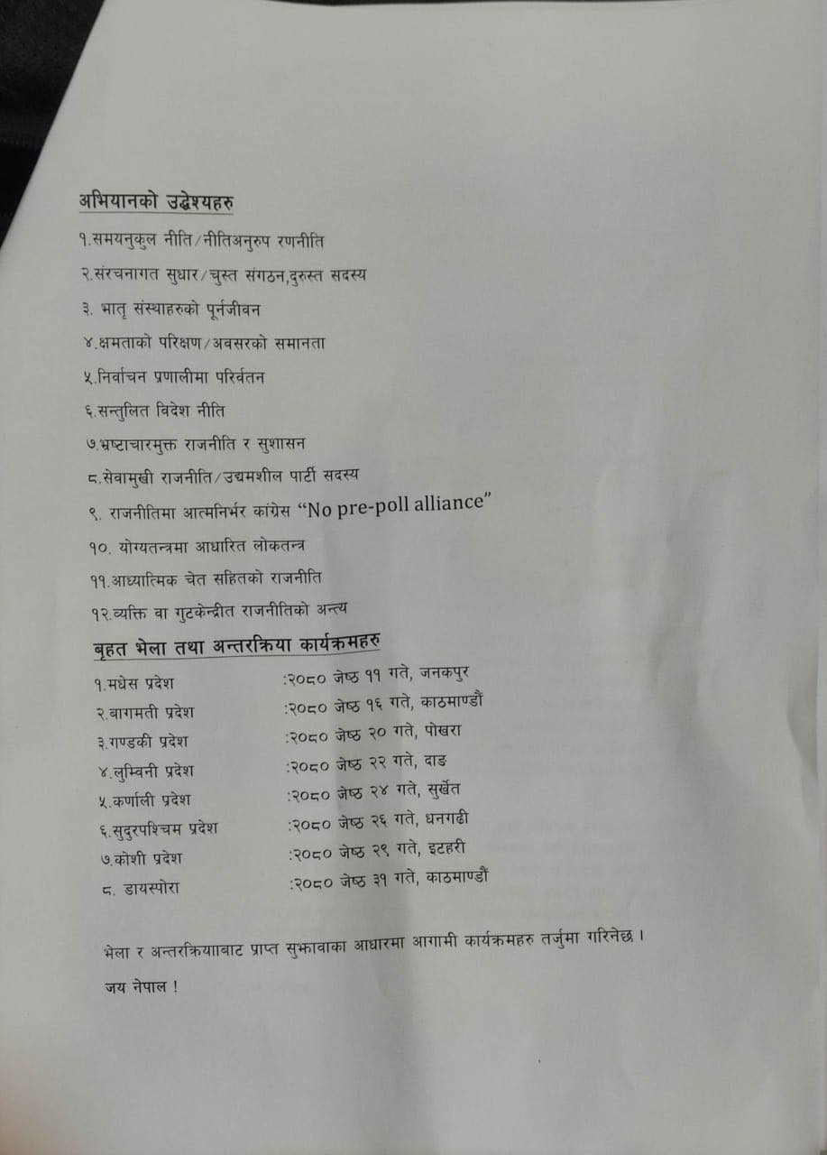 कामाडौं । नेपाली कांग्रेसका संस्थापन इतर असन्तुष्ट समूहले देशैभरी अलग्गै भेला गर्ने भएका छन् ।
