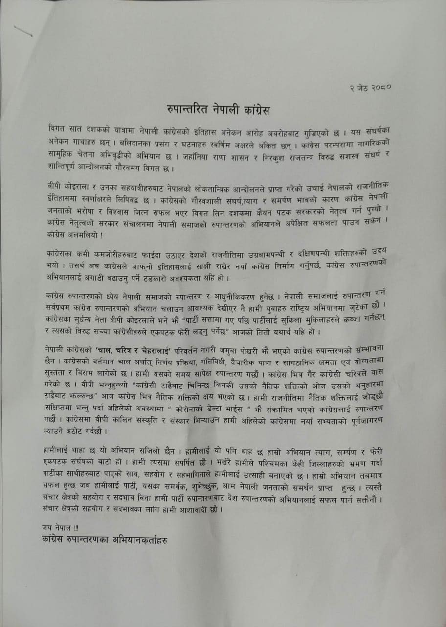 कांग्रेसलाई रुपान्तरण गर्नका लागि सो भेला आयोजना गरिन लागेको आयोजकहरुले जानकारी दिएका छन् ।